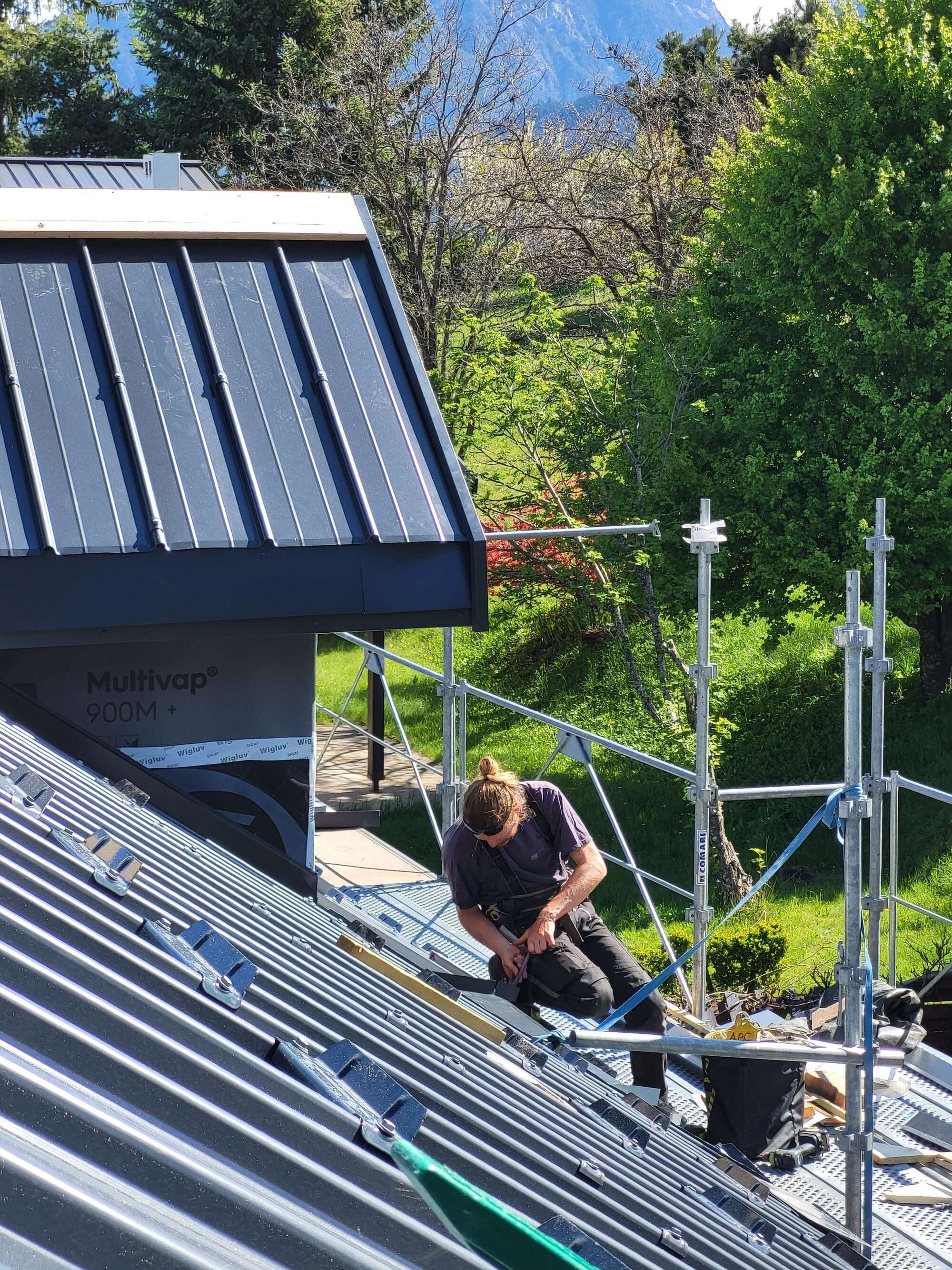 Au programme de ce chantier de printemps, démontage de l’ancienne couverture en bardeaux bitumineux, pose d’un nouveau pare-pluie et couverture neuve en bac aciers! Un sympathique chantier avec une très belle vue sur la vallée de la Durance et les Ecrins, et des singularités de toiture intéressantes à traiter avec deux lucarnes et deux croupes. De l’intensité au démontage, et de la réflexion en zinguerie, ça c’est les chantiers appréciés par l’équipe Acrobois!