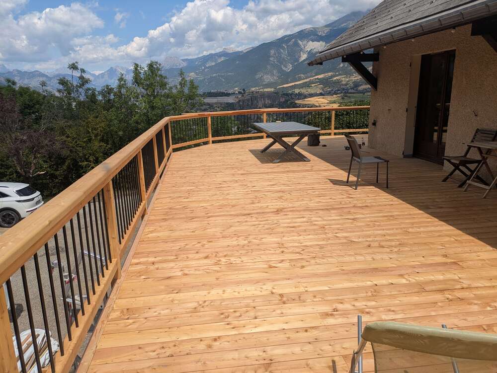 Les gardes-corps sont fabriqués par nos soins, constitués de poteaux et mains-courantes mélèze, et un barreaudage en métal laqué noir des plus élégants.