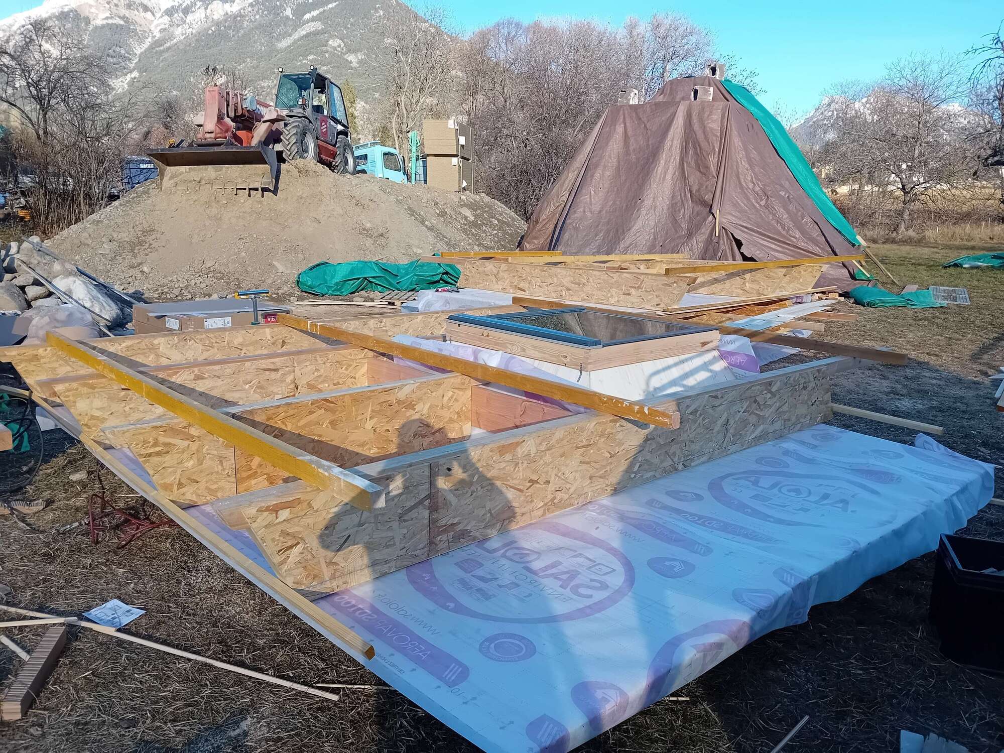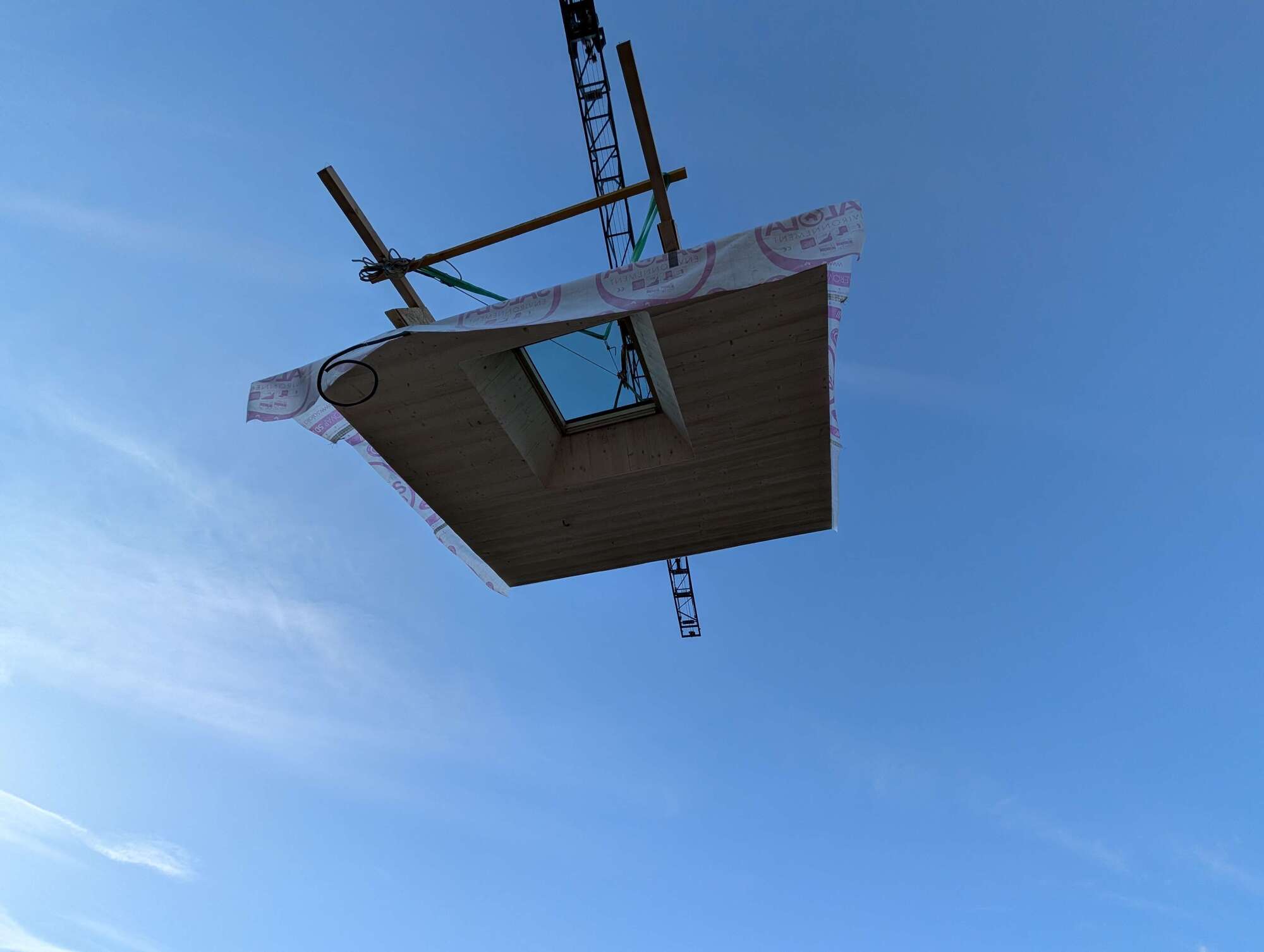 Pari réussi pour cette fois, tous les modules préfabriqués sont levés en 2 journées, et le pare-pluie est posé dans la foulée. La maison est prête à passer Noël au sec!